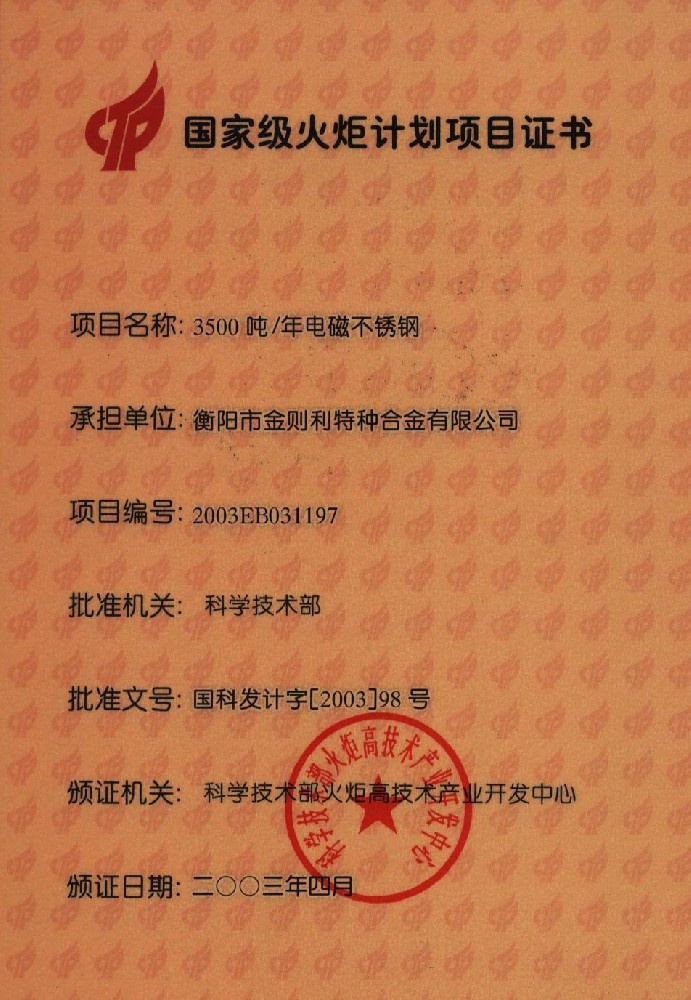 國(guó)家級(jí)火炬計(jì)劃項(xiàng)目證書(shū) |